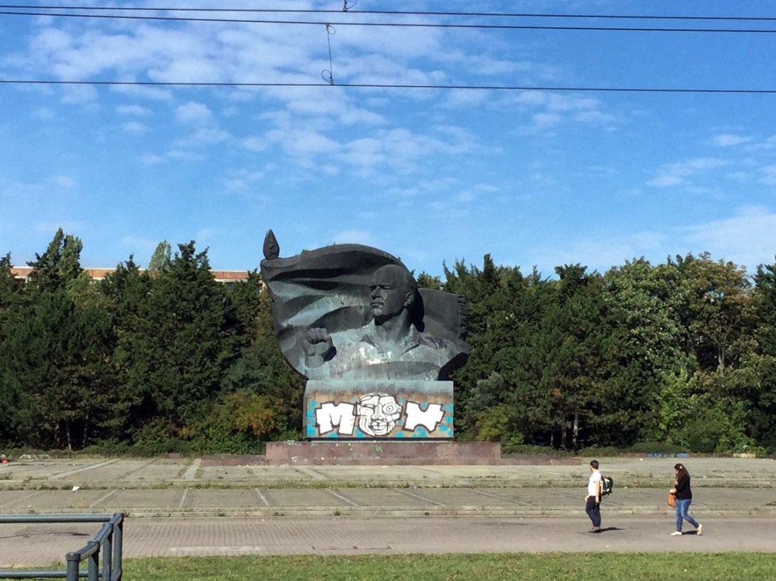 L’entrée du Ernst-Thälmann-Park, avec le monument gigantesque en prime. / The entrance to the Ernst-Thälmann-Park, with its giant monument.
