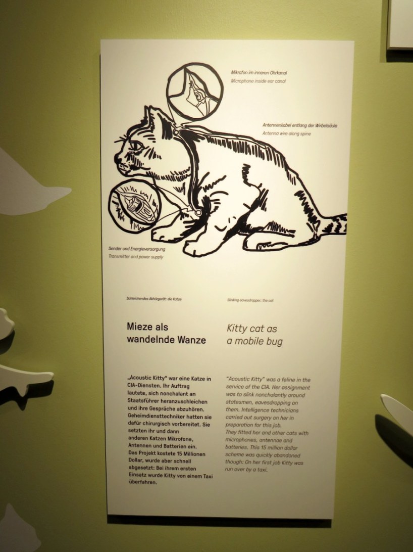 Hah. Un projet visant à équiper des animaux de micros afin de faire de l’écoute. Le projet a été relégué aux oubliettes après que le premier prototype s’est fait écraser par un taxi. Oops. / A new research project suggested fitting pets with microphones and cameras. The project was ditched after the first prototype was run over by a taxi. Oops.