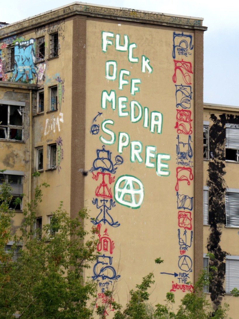 Haha. Media Spree est un mégaprojet de modernisation (donc $) des rives de la rivière Spree, où l’atmosphère est (était?) pas mal plus bohème/artistique et relaxe. / Hah. Media Spree is a megaproject aiming to modernize (so $$$) the banks of the Spree river, where things are (were?) much more relaxed and easygoing, sort of hippie-punkish-countercultural-style.