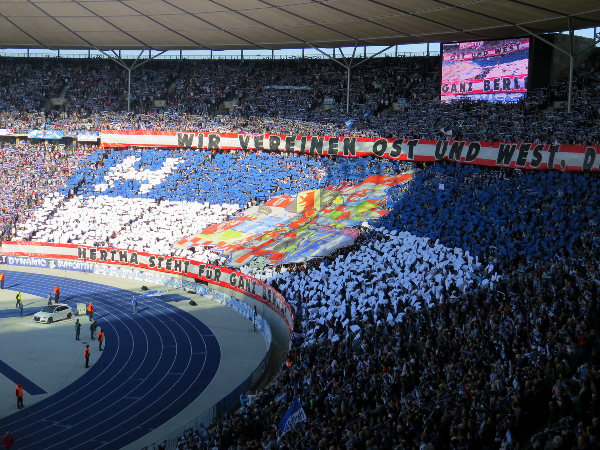 « Choréo » des fans du Hertha. « Nous unissons l’est et l’ouest, donc Hertha représente tout Berlin ». / A « choreo » from the Hertha fans. « We unite East and West, so Hertha represents all of Berlin ».