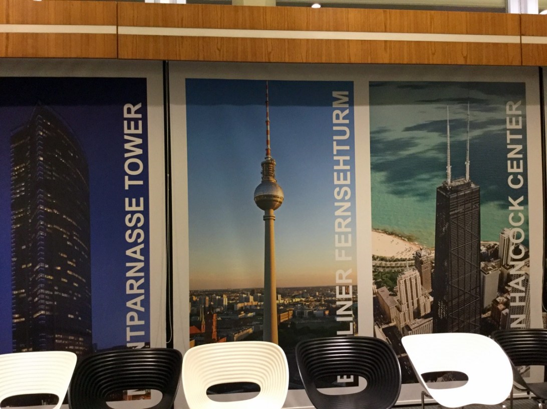 Dans la tour. On a droit à plusieurs images d’homologues un peu partout. La Fernsehturm a déjà été élue la plus laide de toutes (avec la Žižkov Television Tower de Prague en 2e place — heureusement, j’ai visité les 2!) / Inside the tower. There were a few pictures of other towers — the Fernsehturm was recently voted the ugliest of them all — with the Žižkov Television Tower (Prague) in 2nd place. Fortunately, I’ve visited both!