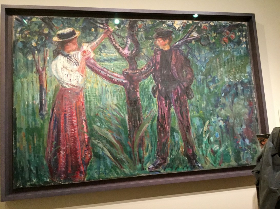 Variation sur Adam et Eve. Ils sont habillés, Adam est passif et même distant, l’arbre les sépare clairement, etc. / Munch’s version of Adam and Eve. Both are clothed, Adam is passive and almost distant, the tree separates both of them, etc.
