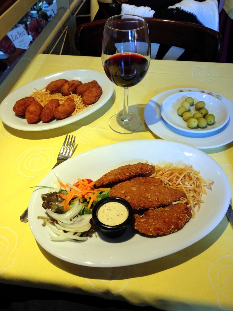 Poulet croustillant, croquetas, olives, vino. Menoum. / Breaded chicken, croquetas, olives and vino. Yum.