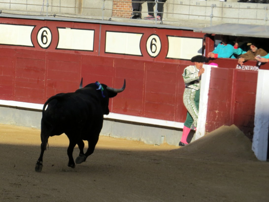 Au tout début, ils se cachent. C’est seulement pour fatiguer le taureau. / At first, the bullfighters hide. That’s to tire the bull out.