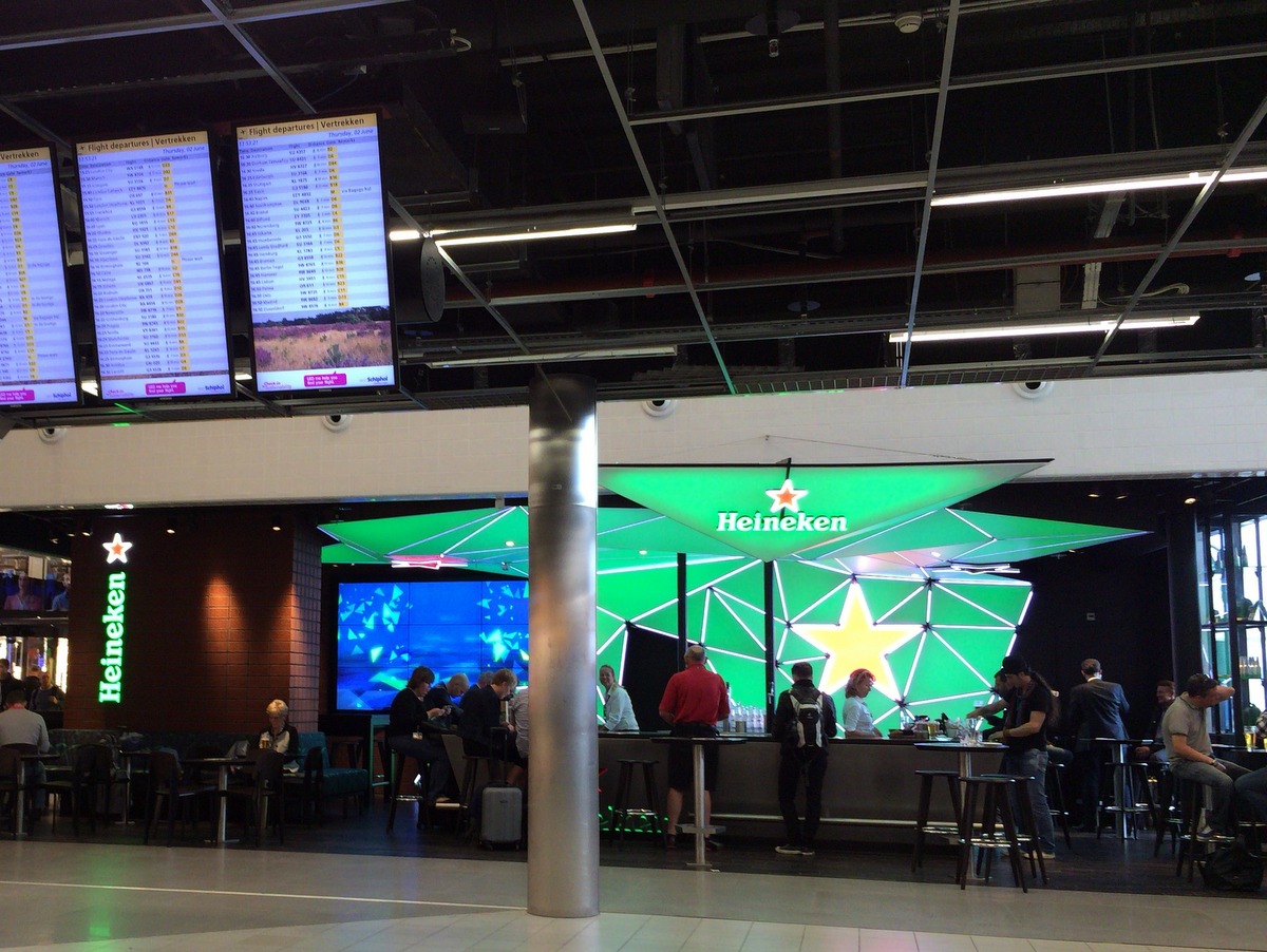 On vérifie sa porte d’embarquement, ou on se prend une Heineken (qui goûte *bon* ici)… Dilemme! / Do I check what gate I must go to, or do I order a Heineken (they are actually good in Amsterdam)? Decisions…