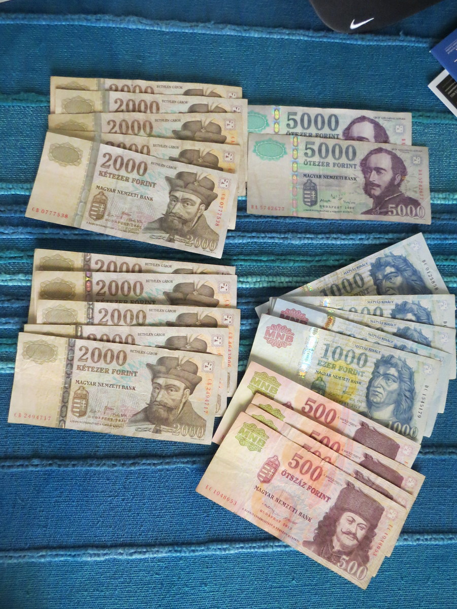 Je suis riche, ahhh! En fait, 37 000 forints équivalent à environ 190 $CAN. / I’m rich! Actually, 37,000 forints (Hungary) turns out to be 190 $CAN or so.