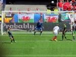 - Coup franc pour le Pays-de-Galles. Bale imite la posture de Cristiano Ronaldo. / Free kick for Wales. Bale is channeling Ronaldo.