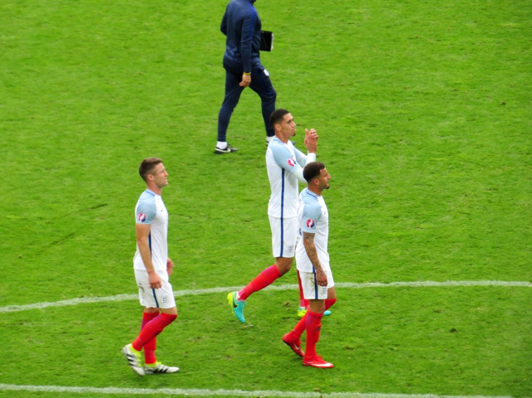 Trio défensif anglais : Cahill, Smalling, Walker. / English defensive trio: Cahill, Smalling and Walker.