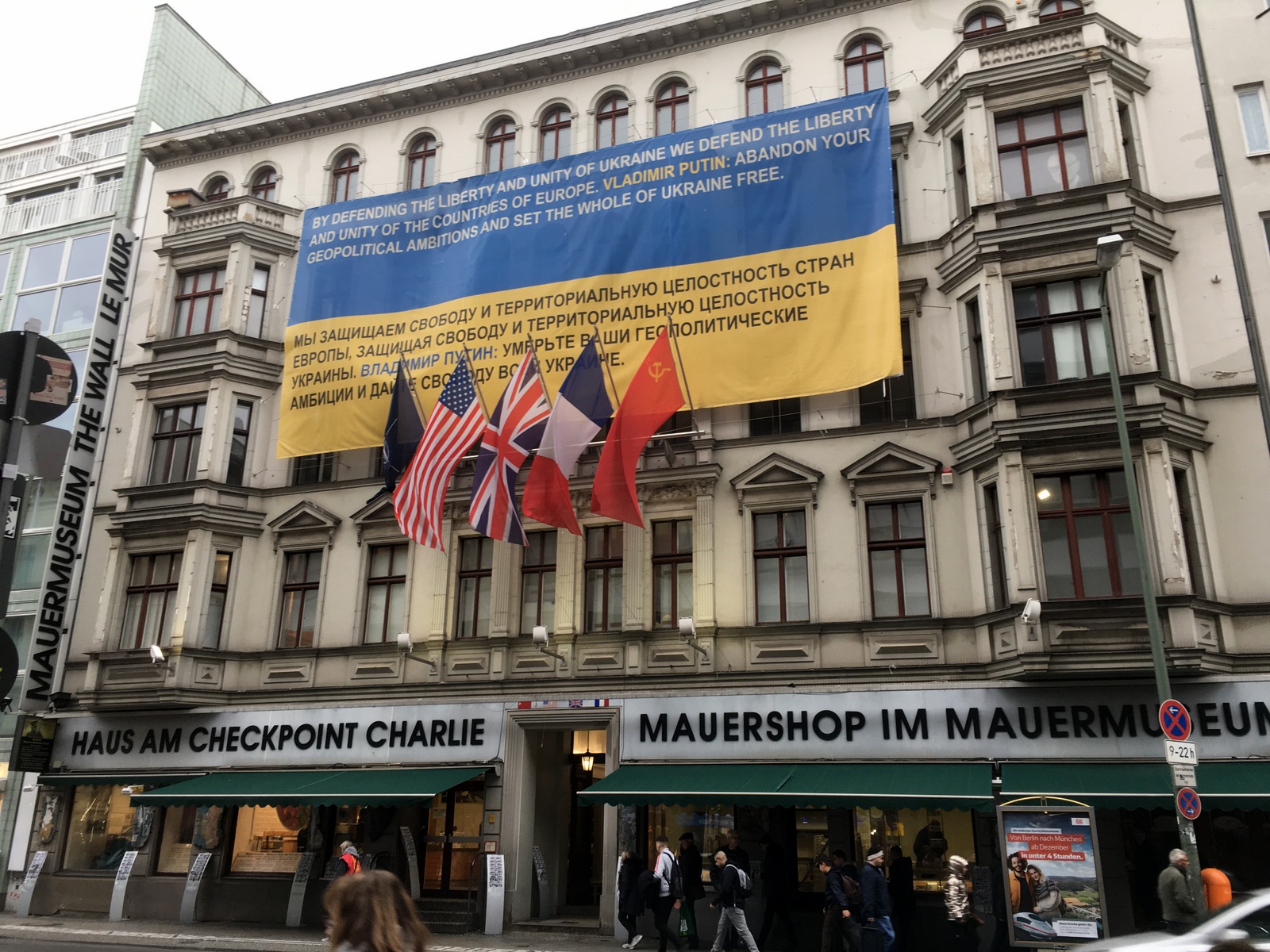 À Checkpoint Charlie, bannière de protestation contre l’action russe en Ukraine. / At Checkpoint Charlie, a banner protesting the Russian action in Ukraine.