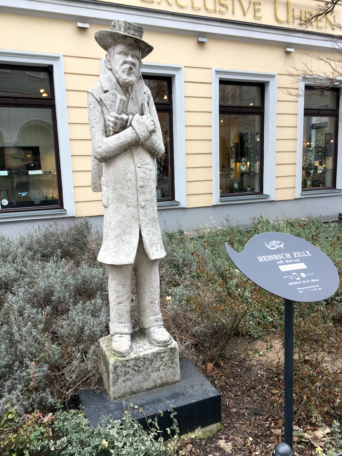 Statue de l’illustrateur Heinrich Zille, connu pour ses portraits humoristiques du quotidien berlinois. Pensez à Norman Rockwell, avec une forte touche de satire. / Statue of Heinrich Zille, famous illustrator. He was well-known for his humorous depictions of day-to-day life in Berlin. Think Norman Rockwell, with a strong touch of biting satire.