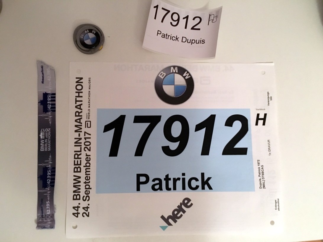 Voici ce dont j’ai besoin pour aujourd’hui… bracelet pour traverser la zone de sécurité, puce électronique pour mesurer le temps, étiquette pour mon sac à vêtements et numéro. / Here’s what I’ll need for today: wristband (to get past the checkpoint), chip to measure the distance, sticker for the clothes bag and official number.