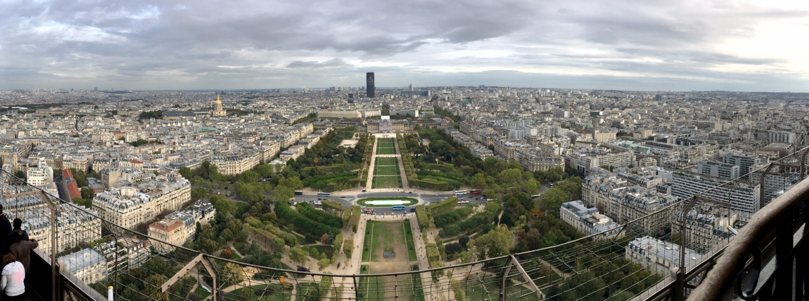 Le Champ de Mars, avec la Tour Montparnasse en arrière-plan. / The Champ de Mars, with the Montparnasse Tower in the background.