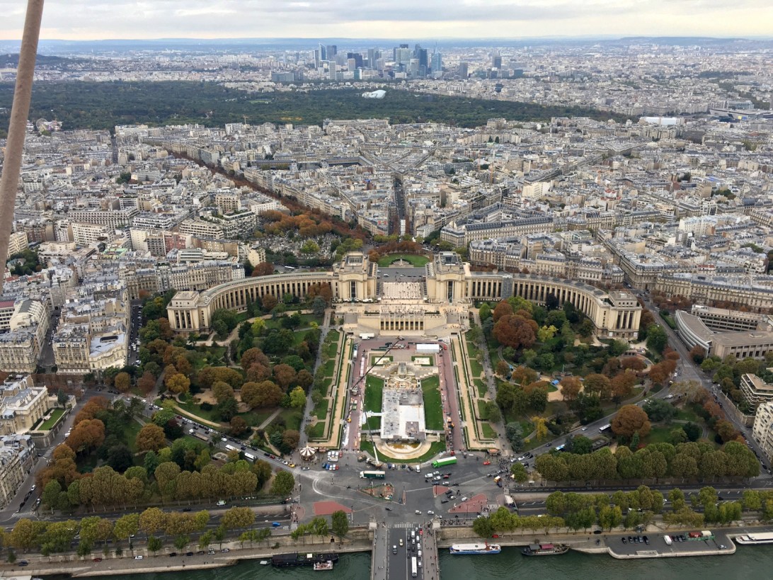 Les Jardins du Trocadéro, de l’autre côté du Champ de Mars (direction nord-ouest — le Champ de Mars est direction sud-est). / Jardins du Trocadéro, on the other side of the Champ de Mars (this is looking towards the north-west — the Champ de Mars is oriented towards the south-east.)