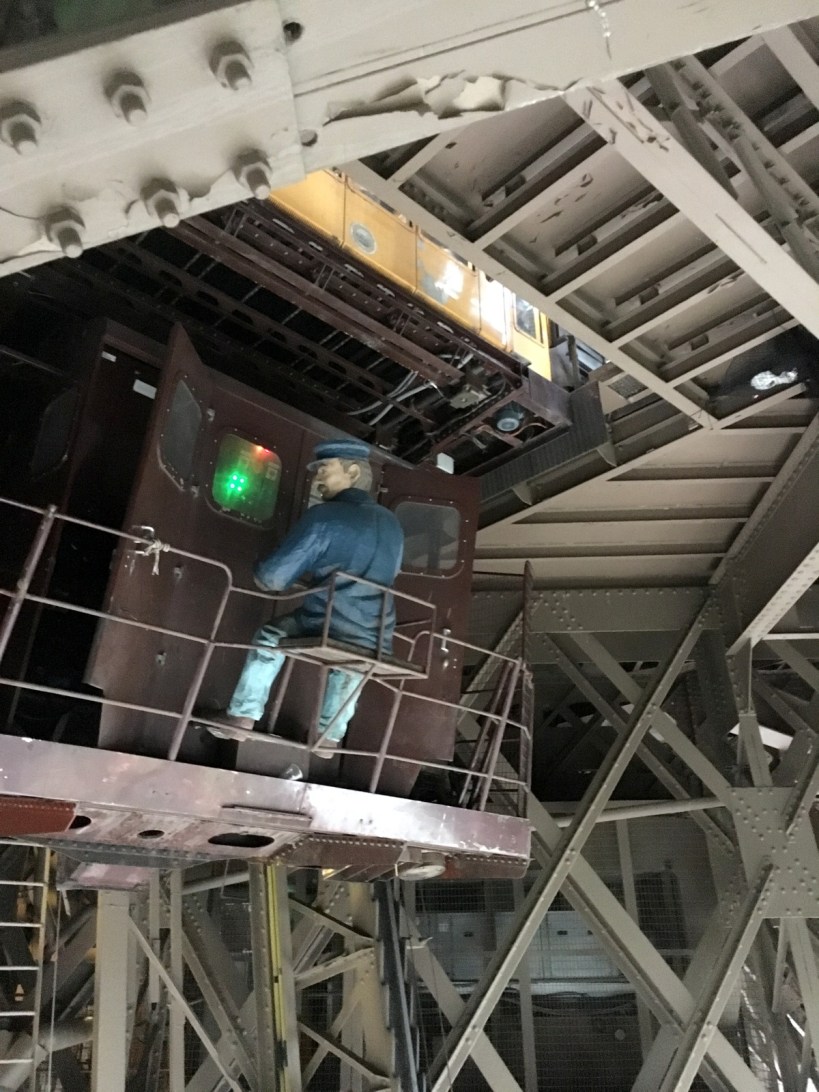 Ce mannequin-là nous a fait faire le saut! L’espèce de cabine montait assez vite, et pendant une fraction de seconde on croyait qu’il y avait vraiment une personne assise là, à monter comme une balle, sans aucun dispositif de sécurité. / That plastic mannequin startled us quite a bit. That booth thing was going up quite fast, and for a half-second we thought there was an actual person just sitting there, going up, without any safety equipment.