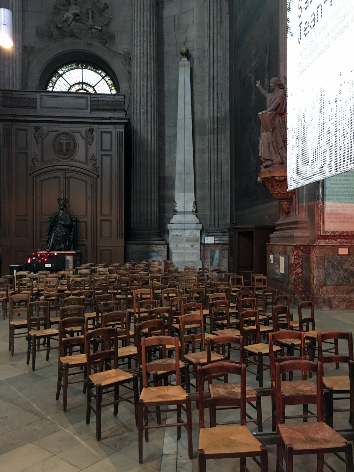 Wikipedia : « Le gnomon de l’église Saint-Sulpice est un appareil de mesure astronomique situé dans l’église Saint-Sulpice de Paris, France. C’est une méridienne, appelée traditionnellement gnomon, dispositif conçu ici pour projeter l’image du Soleil sur le sol, afin de déterminer des éléments fondamentaux de son mouvement annuel dans le ciel. » / From Wikipedia: « The Gnomon of Saint-Sulpice is an astronomical measurement device located in the Church of Saint-Sulpice (Église Saint-Sulpice) in Paris, France. It is a gnomon, a device designed to cast a shadow on the ground in order to determine the position of the sun in the sky. »