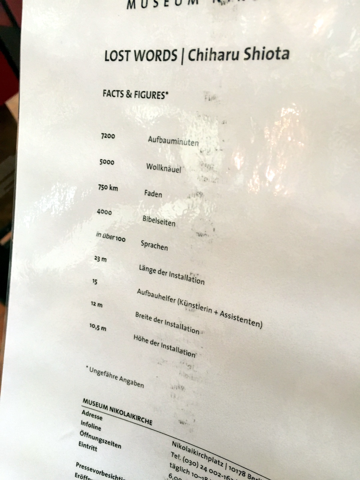 Quelques statistiques : minutes à construire, balles de laine, longueur de fil, pages de la Bible, langues, longueur, personnel nécessaire, largeur, hauteur. / A few stats: Minutes necessary to build, balls of wool, thread length, pages of the Bible, languages, length, personnel needed, width, height.
