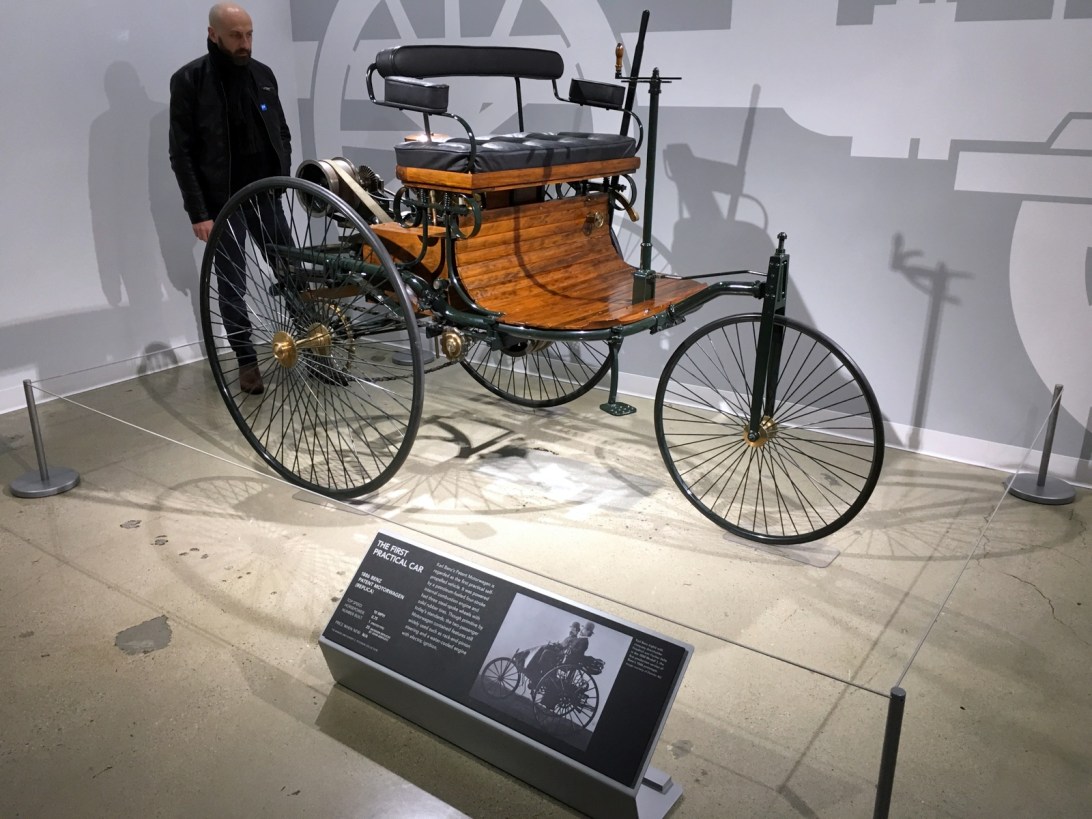 Benz, de 1886. Le gars n’est pas un mannequin (pendant une fraction de seconde, j’ai eu un doute) — d’ailleurs, il aurait été habillé bizarre pour l’époque. / 1886 Benz. The guy is an actual guy, not a mannequin (I did a double-take) — he would have been dressed weird for the era anyway.