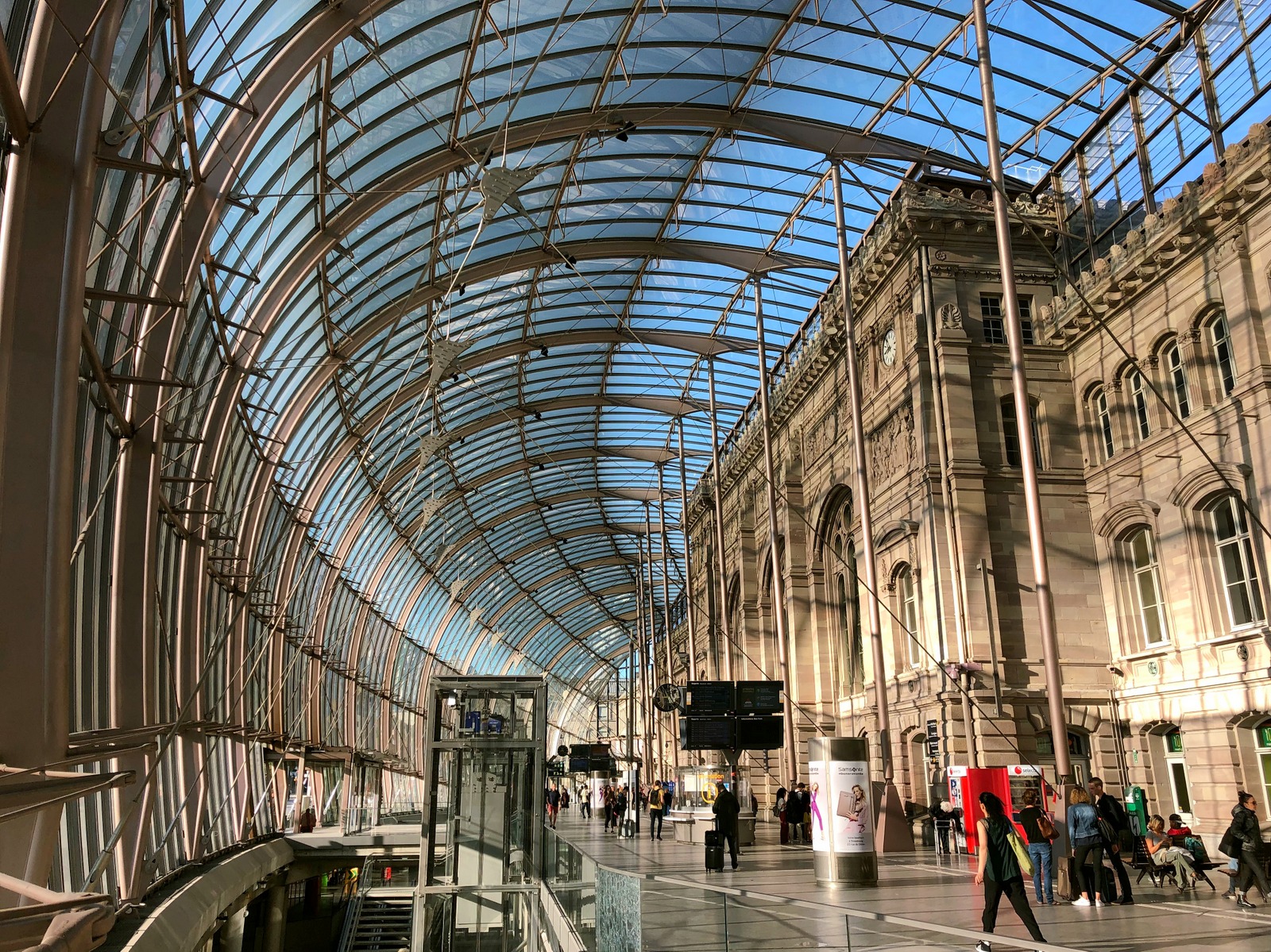 À la magnifique gare de Strasbourg. Un mélange très réussi de neuf et de vieux. / At the stunning Strasbourg train station. A very nice mix of old and new.