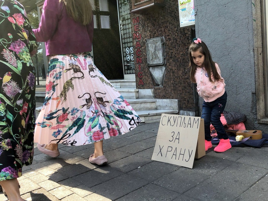 La petite fille a deux bras, malgré les apparences. « Je recueille de l’argent pour de la nourriture ». Tout ça me semble suspect — elle est plutôt bien habillée, non? / This girl does have both her arms, despite what it looks like. The sign says « Collecting money for food ». Smells fishy, no? She’s dressed immaculately…