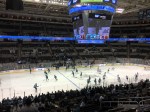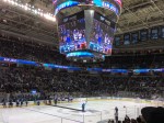 - J’ai levé les yeux au ciel à quelques reprises, par contre. À chaque avantage numérique, ils font jouer le thème de Jaws et tout le monde font un geste de « bouche de requin qui ouvre et ferme »… Quétaine à mort, mais bon. / I have to admit I rolled my eyes quite a few times. On every power play, they’d play the Jaws theme and people would do the « shark’s mouth opening and closing » with their hands. Super-lame, but oh well.