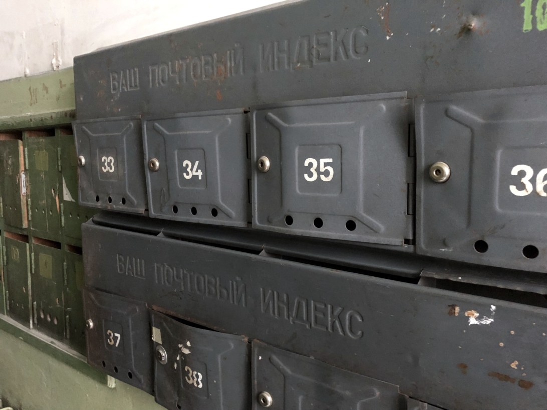 Au rez-de-chaussée de mon AirBnB. Inscription en russe (et non en letton — souvenez-vous que la Lettonie faisait partie de l’URSS) qui dit « VOTRE CODE POSTAL ». Intéressant! / On the ground floor of my AirBnB. This is in Russian (not in Latvian — remember, Latvia was part of the USSR), and it says YOUR ZIP CODE.