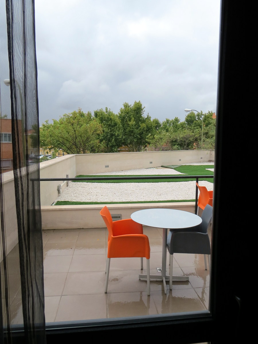 À droite du lit, une petite terrasse. Dommage qu’il pleuve! / To the right of the bed, a small terrace. Too bad it’s raining!