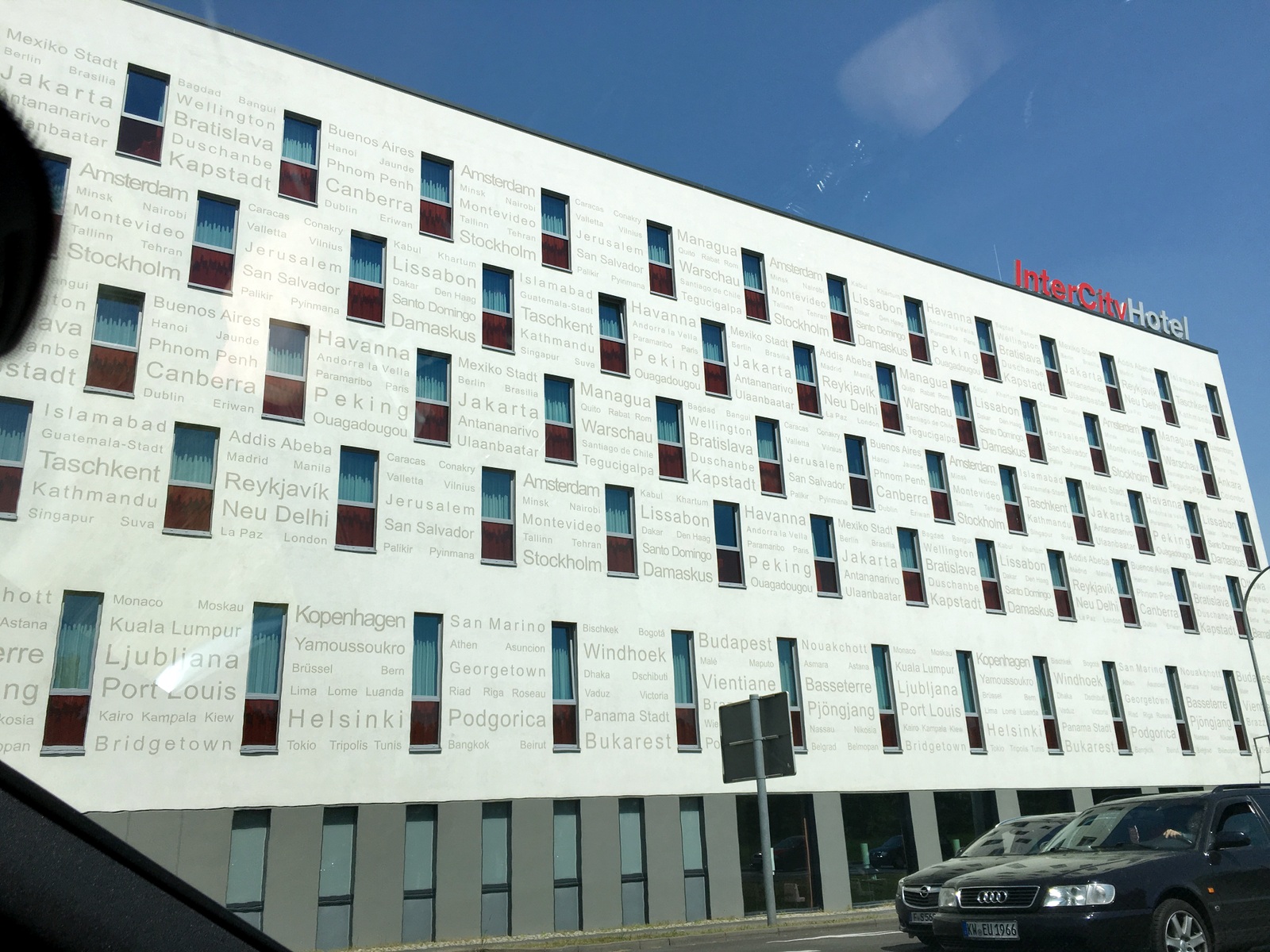 Berlin, YAY! Un hôtel près de l’aéroport. J’aime les noms de ville sur la façade. / Berlin, YAY! Here’s some hotel near the airport. I like the city names written there…