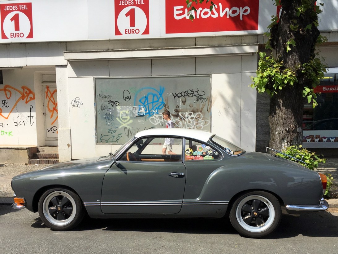 Une Porsche old school devant un « Dollarama ». / An old-school Porsche parked in front of a dollar store.