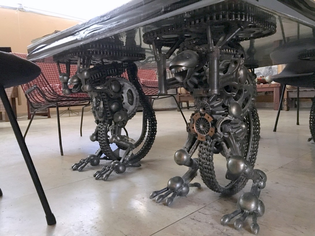 Dans une salle de repos. On peut pas faire mieux comme pattes de table. / In a break room. You can’t beat that for table legs.