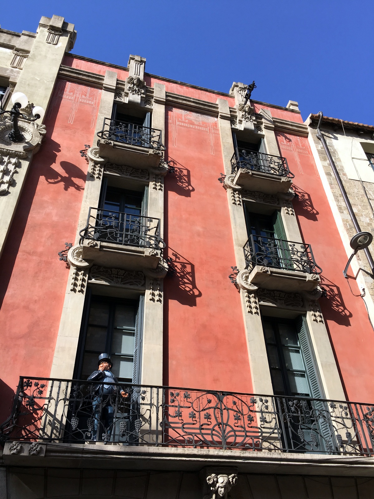 Dans le Barri Gotic, si je me souviens. C’était la façade d’un théâtre (remarquez le mannequin en bas à gauche). / In the Barri Gotic. I think this was a comedy theater (notice the statue on the bottom left).