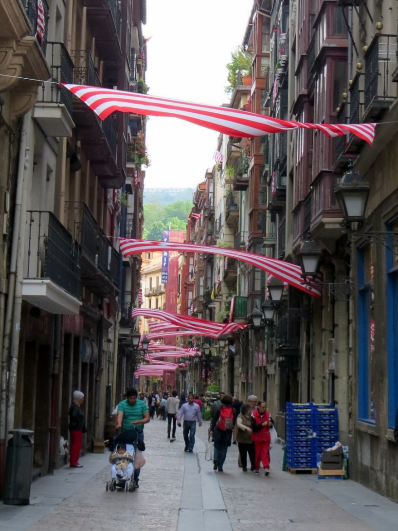 Maintenant dans la vieille ville. Les banderolles servent à encourager l’équipe (c’était avant la finale de la Copa del Rey). / Now in the Old Town. Those banners are the same colors as the club (this was shot before the final of the Copa del Rey).